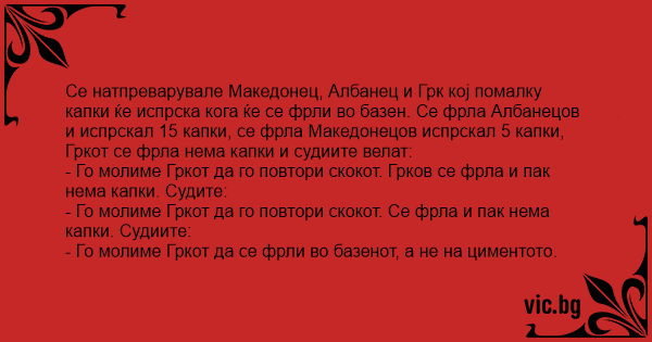 Се натпреварувале Македонец, Албанец и Грк кој помалку капки ќе испрска кога ќе се фрли во базен. Се фрла Албанецов и испрскал 15 капки, се фрла Македонецов испрскал 5 капки, Гркот се фрла нема капки и судиите велат: