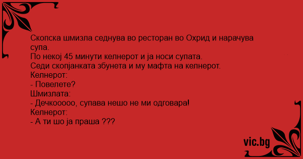 Скопска шмизла седнува во ресторан во Охрид и нарачува супа.