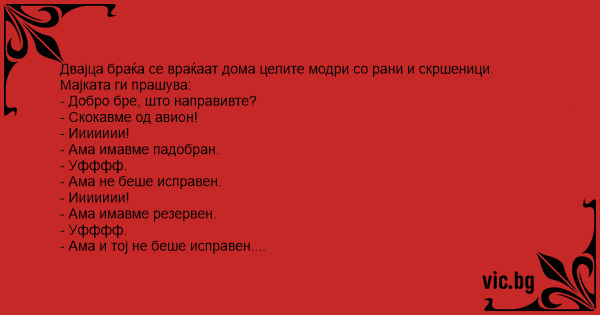 Двајца браќа се враќаат дома целите модри со рани и скршеници. Мајката ги прашува: