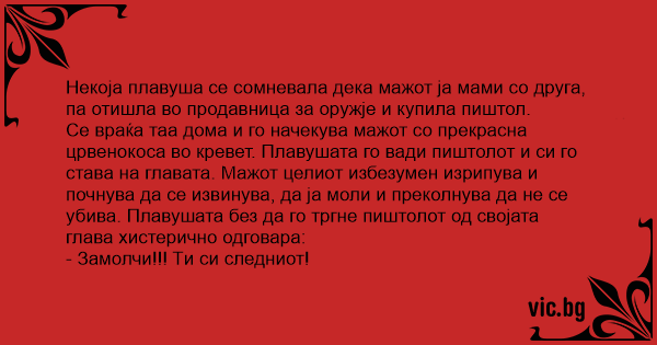 Се враќа таа дома и го начекува мажот со прекрасна црвенокоса во кревет. Плавушата го вади пиштолот и си го става на главата. Мажот целиот избезумен изрипува и почнува да се извинува, да ја моли и преколнува да не се убива. Плавушата без да го тргне пиштолот од својата глава хистерично одговара: