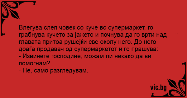 Влегува слеп човек со куче во супермаркет, го грабнува кучето за јажето и почнува да го врти над главата притоа рушејќи све околу него. До него доаѓа продавач од супермаркетот и го прашува:
