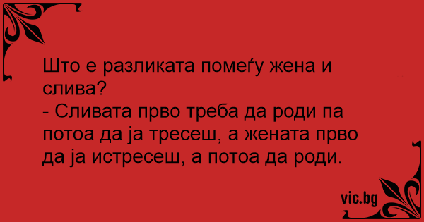 - Сливата прво треба да роди па потоа да ја тресеш, а жената прво да ја истресеш, а потоа да роди.