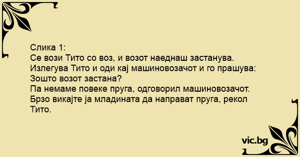 Се вози Тито со воз, и возот наеднаш застанува. Излегува Тито и оди кај машиновозачот и го прашува:
