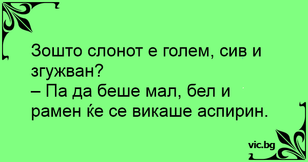 Зошто слонот e голем, сив и згужван? – Па да беше мал, бел и рамен ќе се викаше аспирин.