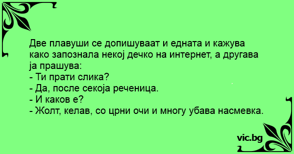 Две плавуши се допишуваат и едната и кажува како запознала некој дечко на интернет, а другава ја прашува: