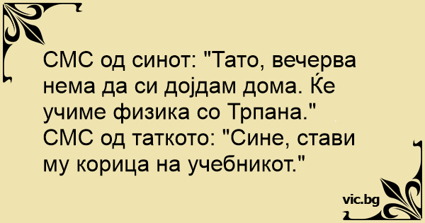 СМС од синот: "Тато, вечерва нема да си дојдам дома. Ќе учиме физика со Трпана."