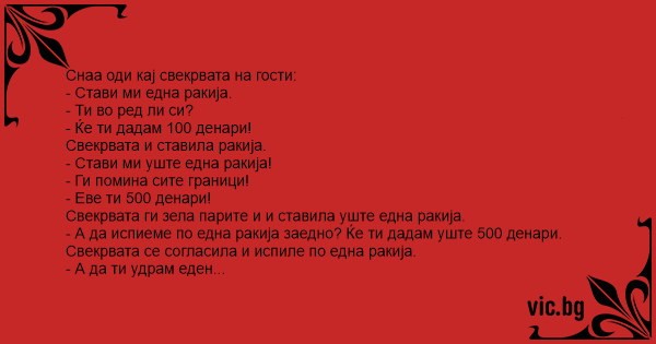 Свекрвата ги зела парите и и ставила уште една ракија.
