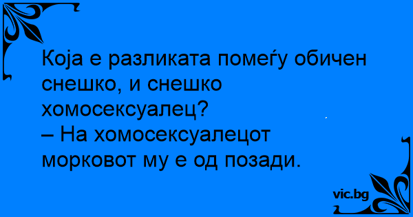 А разликата между снежния и нежния човек е, че на нежния моркова се слага отзад!!! Woran erkennt man einen schwulen Schneemann? – Er hat die Möhre unten und auf der falschen Seite. Jak poznáte sněhuláka "buzeranta"? . . Má mrkev v zadku. Ein schwulen Schneemann