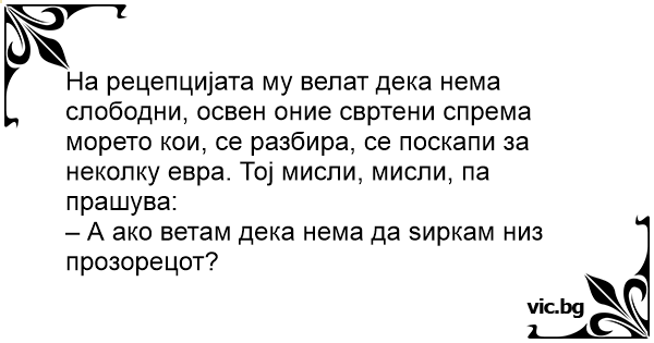 На рецепцијата му велат дека нема слободни, освен оние свртени спрема морето кои, се разбира, се поскапи за неколку евра. Тој мисли, мисли, па прашува:
