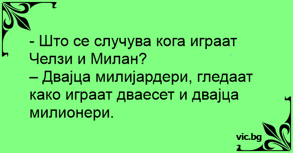 - Kas tas ir, kad spēlē “Čelsija” un “Milāna”? - Divi miljardieri skatās, kā spēlē divdesmit divi miljonāri.