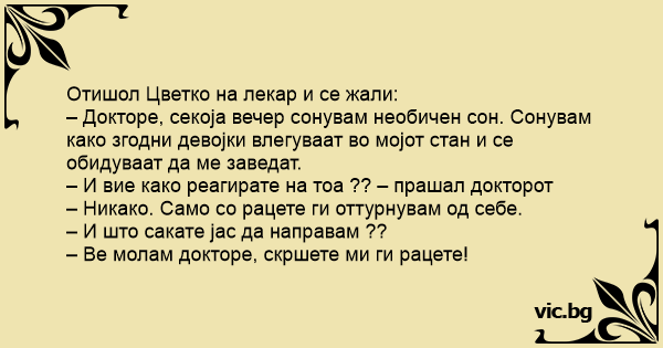 – Докторе, секоја вечер сонувам необичен сон. Сонувам како згодни девојки влегуваат во мојот стан и се обидуваат да ме заведат.