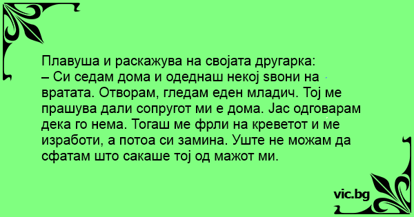 – Си седам дома и одеднаш некој ѕвони на вратата. Отворам, гледам еден младич. Тој ме прашува дали сопругот ми е дома. Јас одговарам дека го нема. Тогаш ме фрли на креветот и ме изработи, а потоа си замина. Уште не можам да сфатам што сакаше тој од мажот ми.