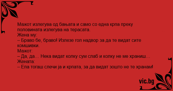 – Браво бе, браво! Излезе гол надвор за да те видат сите комшивки.