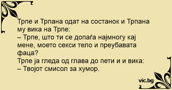 – Трпе, што ти се допаѓа најмногу кај мене, моето cekcи тело и преубавата фаца?