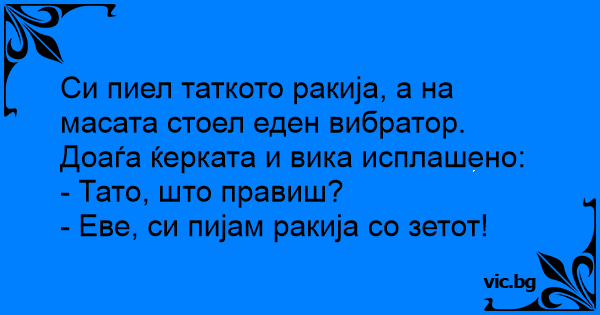 Си пиел таткото ракија, а на масата стоел еден bибpatop. Доаѓа ќерката и вика исплашено: