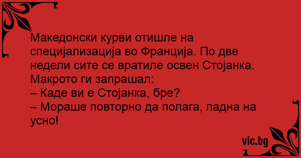 Македонски kуpbи отишле на специјализација во Франција. По две недели сите се вратиле освен Стојанка. Макрото ги запрашал: