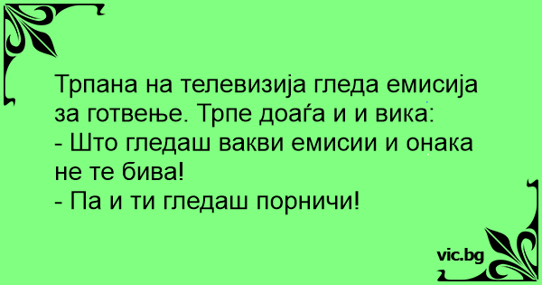 Трпана на телевизија гледа емисија за готвење. Трпе доаѓа и и вика: