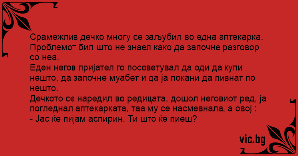 Дечкото се наредил во редицата, дошол неговиот ред, ја погледнал аптекарката, таа му се насмевнала, а овој :
