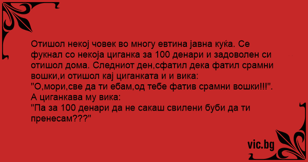 Отишол некој човек во многу евтина јавна куќа. Се фукнал со некоја циганка за 100 денари и задоволен си отишол дома. Следниот ден,сфатил дека фатил срамни вошки,и отишол кај циганката и и вика: