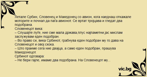 Летале Србин, Словенец и Македонец со авион, кога наеднаш откажале моторите и почнал да паѓа авионот. Се вртат тројцава и гледат два подобрана.