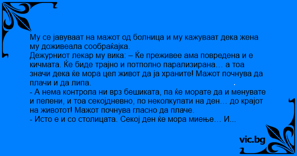 Дежурниот лекар му вика: – Ќе преживее ама повредена и е кичмата. Ќе биде трајно и потполно парализирана… а тоа значи дека ќе мора цел живот да ја храните! Мажот почнува да плачи и да липа.