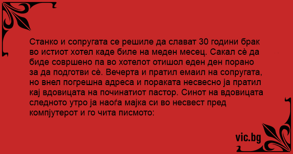 Станко и сопругата се решиле да слават 30 години брак во истиот хотел каде биле на меден месец. Сакал сè да биде совршено па во хотелот отишол еден ден порано за да подготви сè. Вечерта и пратил емаил на сопругата, но внел погрешна адреса и пораката несвесно ја пратил кај вдовицата на починатиот пастор. Синот на вдовицата следното утро ја наоѓа мајка си во несвест пред компјутерот и го чита писмото: