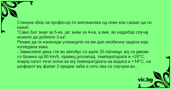 - Замислете дека сте во автобус со уште 25 патници, кој се движи со брзина од 60 km/h, правец југозапад, температурата е +20°C, покрај патот тече поток во кој температурата на водата е +14°C, на шоферот му фалат 2 предни заба и сето ова се случува во сабота.