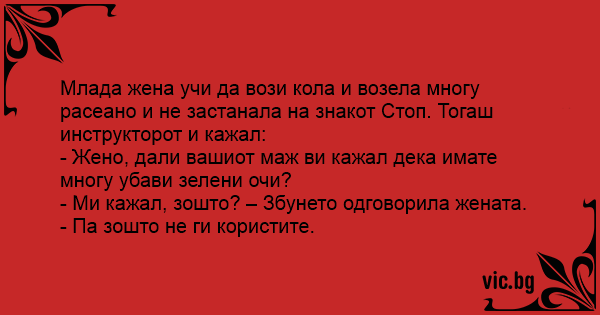 Млада жена учи да вози кола и возела многу расеано и не застанала на знакот Стоп. Тогаш инструкторот и кажал: