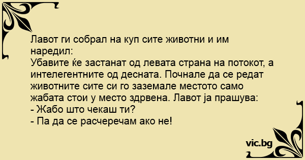 Убавите ќе застанат од левата страна на потокот, а интелегентните од десната. Почнале да се редат животните сите си го заземале местото само жабата стои у место здрвена. Лавот ја прашува: