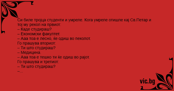 Си биле тројца студенти и умреле. Кога умреле отишле кај Св.Петар и тој му рекол на првиот: