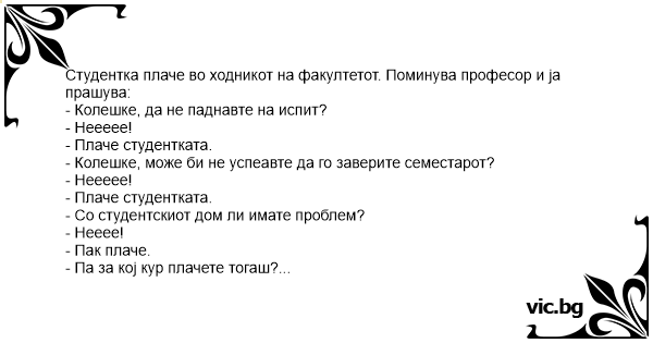 Студентка плаче во ходникот на факултетот. Поминува професор и ја прашува: