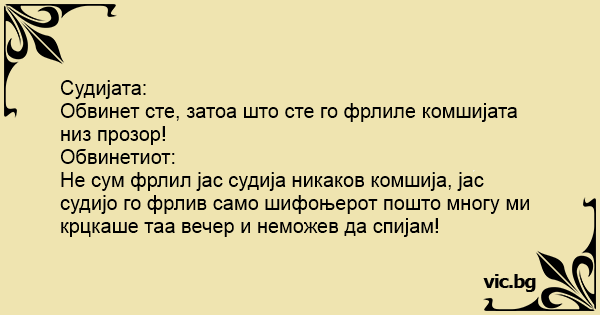 Не сум фрлил јас судија никаков комшија, јас судијо го фрлив само шифоњерот пошто многу ми крцкаше таа вечер и неможев да спијам!
