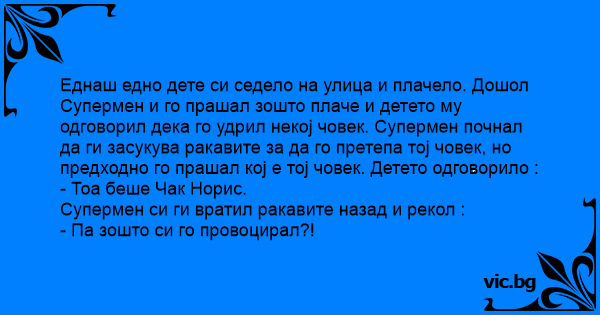 Еднаш едно дете си седело на улица и плачело. Дошол Супермен и го прашал зошто плаче и детето му одговорил дека го удрил некој човек. Супермен почнал да ги засукува ракавите за да го претепа тој човек, но предходно го прашал кој е тој човек. Детето одговорило :