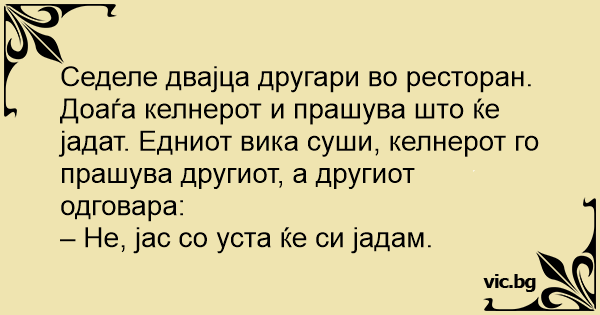 Седеле двајца другари во ресторан. Доаѓа келнерот и прашува што ќе јадат. Едниот вика суши, келнерот го прашува другиот, а другиот одговара: