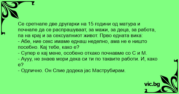 Се сретнале две другарки на 15 години од матура и почнале да се распрашуваат, за мажи, за деца, за работа, па на крај и за сексуалниот живот. Прво едната вика: