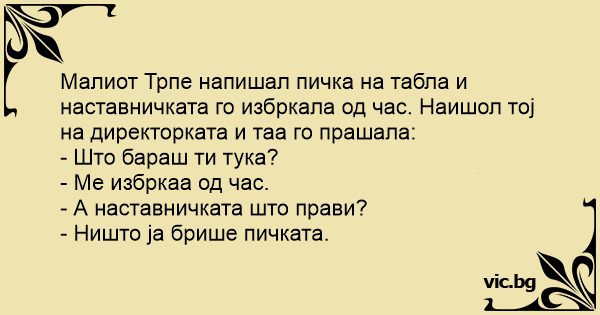 Малиот Трпе напишал пичka на табла и наставничката го избркала од час. Наишол тој на директорката и таа го прашала: