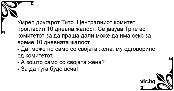 Умрел другарот Тито. Централниот комитет прогласил 10 дневна жалост. Се јавува Трпе во комитетот за да праша дали може да има cekc за време 10 дневната жалост.