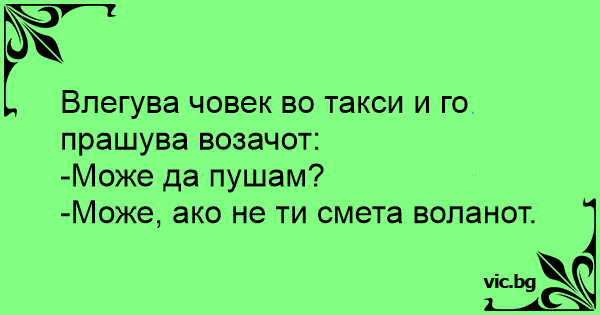 Влегува човек во такси и го прашува возачот: