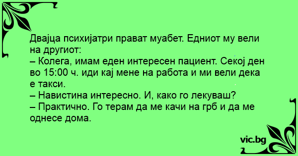 – Колега, имам еден интересен пациент. Секој ден во 15:00 ч. иди кај мене на работа и ми вели дека е такси.