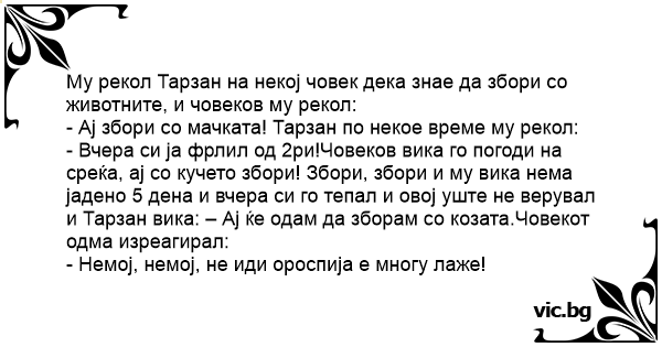- Вчера си ја фрлил од 2ри!Човеков вика го погоди на среќа, ај со кучето збори! Збори, збори и му вика нема јадено 5 дена и вчера си го тепал и овој уште не верувал и Тарзан вика: – Ај ќе одам да зборам со козата.Човекот одма изреагирал: