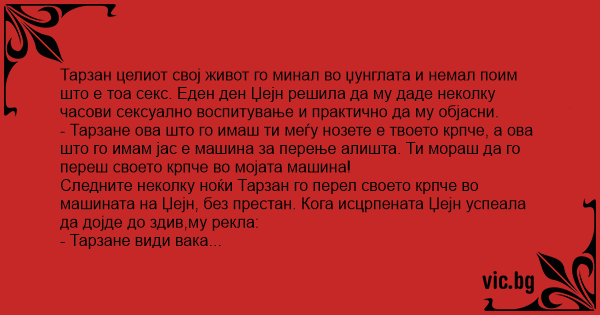 - Тарзане ова што го имаш ти меѓу нозете е твоето крпче, а ова што го имам јас е машина за перење алишта. Ти мораш да го переш своето крпче во мојата машина!