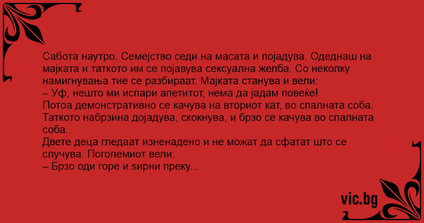 Сабота наутро. Семејство седи на масата и појадува. Одеднаш на мајката и таткото им се појавува сексуална желба. Со неколку намигнувања тие се разбираат. Мајката станува и вели: