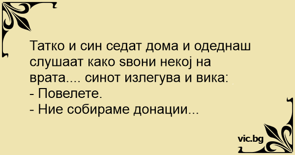 Татко и син седат дома и одеднаш слушаат како ѕвони некој на врата.... синот излегува и вика: