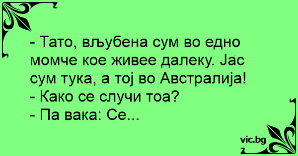 - Тато, вљубена сум во едно момче кое живее далеку. Јас сум тука, а тој во Австралија!