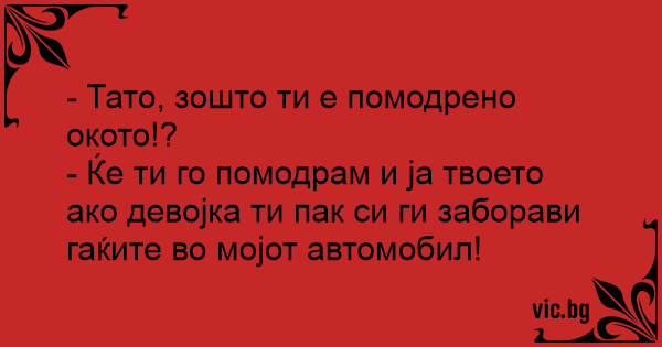 - Ќе ти го помодрам и ја твоето ако девојка ти пак си ги заборави гаќите во мојот автомобил!