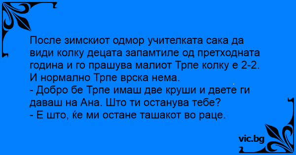 После зимскиот одмор учителката сака да види колку децата запамтиле од претходната година и го прашува малиот Трпе колку е 2-2. И нормално Трпе врска нема.