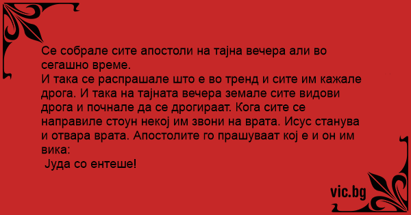 И така се распрашале што е во тренд и сите им кажале дрога. И така на тајната вечера земале сите видови дрога и почнале да се дрогираат. Кога сите се направиле стоун некој им звони на врата. Исус станува и отвара врата. Апостолите го прашуваат кој е и он им вика: