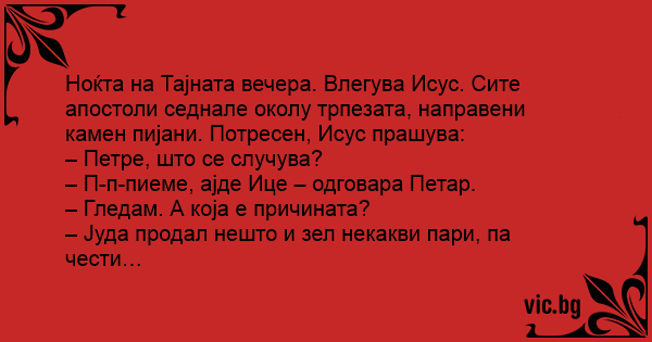 Пристига Исус на тайната вечеря, а там тече щур купон, всички ядат, пият и се забавляват, и никой не му обръща внимание...