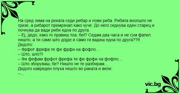 На сред зима на реката седи рибар и лови риба. Рибата воопшто не гризе, а рибарот премрзнал како куче. До него седнува еден старец и почнува да вади риби една по друга.