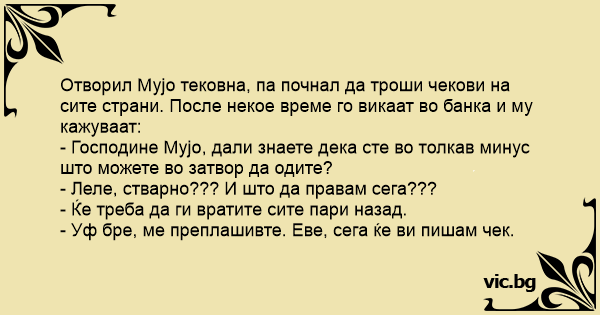 Отворил Мујо тековна, па почнал да троши чекови на сите страни. После некое време го викаат во банка и му кажуваат: